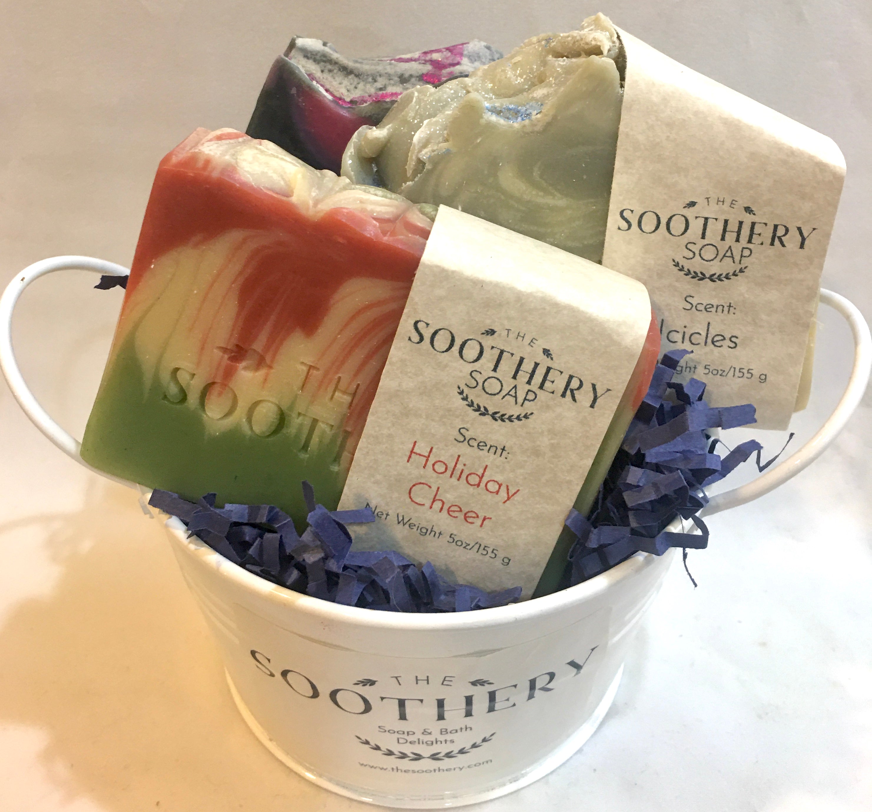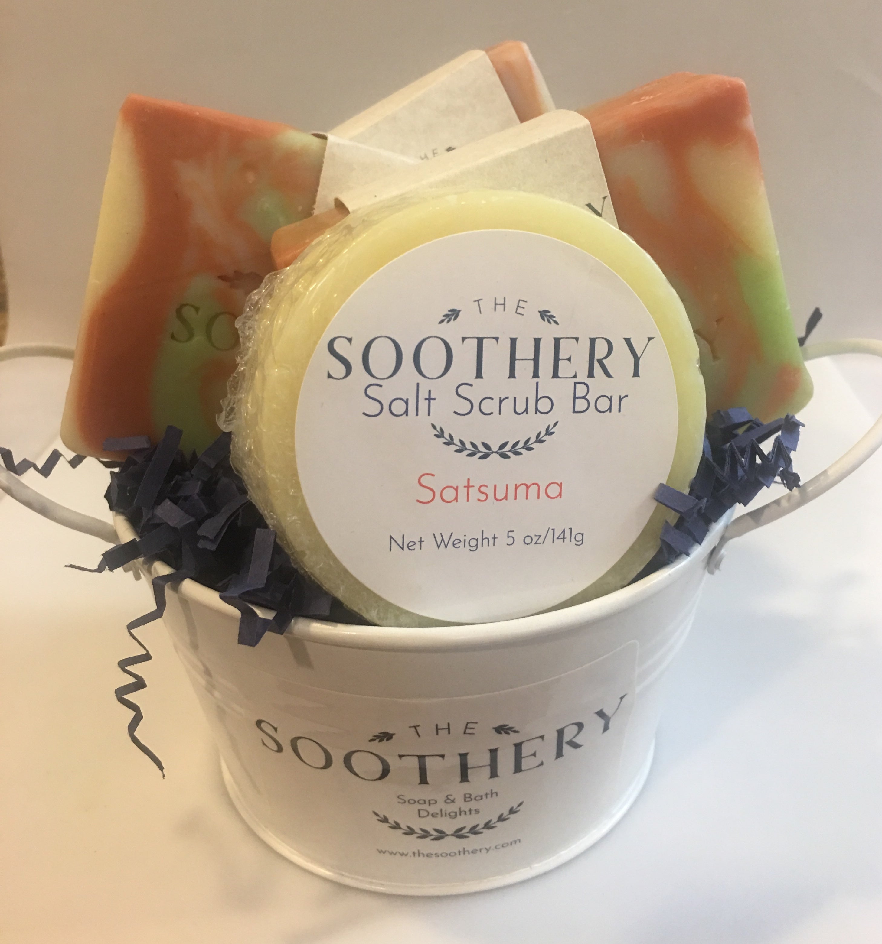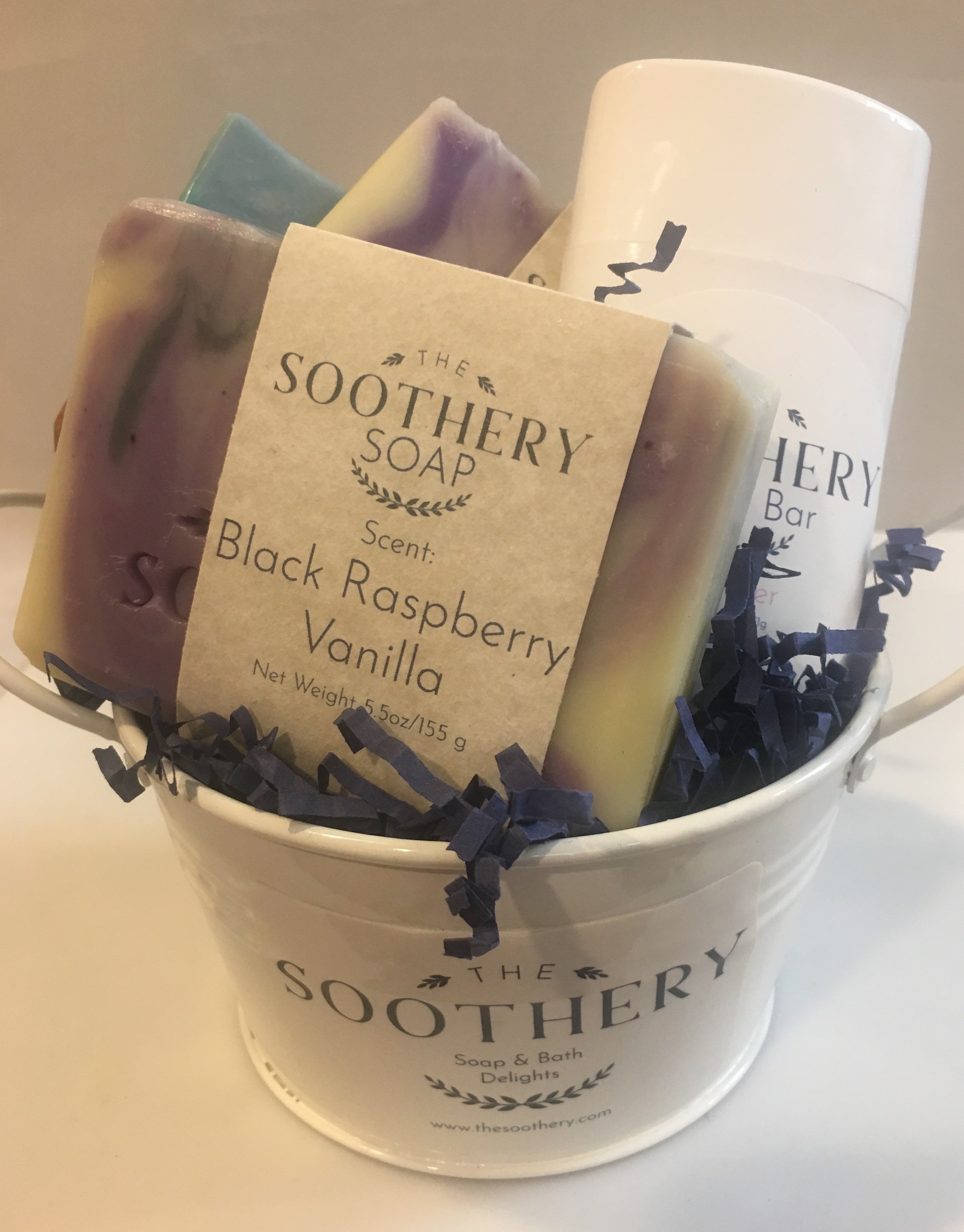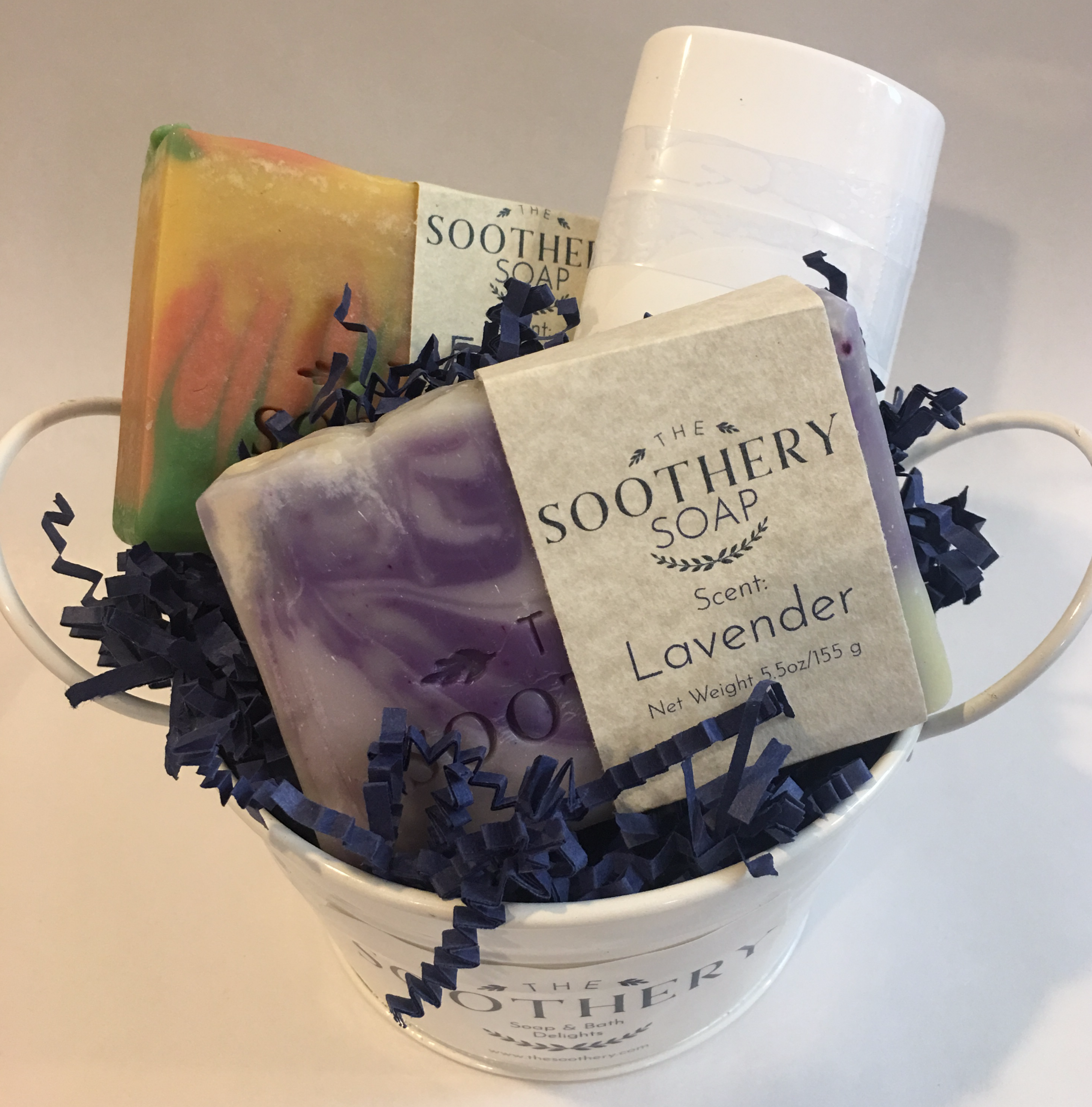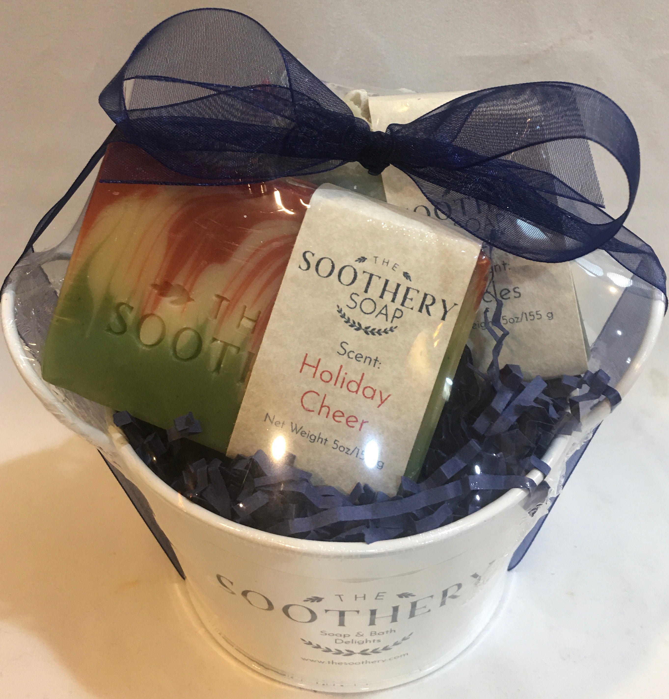 A Gift Basket makes a beautiful gift! They are totally customizable. The group of products you choose come carefully nestled in navy blue crinkle-cut paper, inside of a 5" white metal pail. The Gift Basket is then shrink-wrapped so that the items stay in place, and a signature navy blue bow is placed on the top. A special note can be included as well, attached right under the bow. Please leave a message in the box during checkout if you would like a note attached, along with the exact wording of the note. They are firmly packed inside of a white cube box for shipping and will arrive safe & sound.