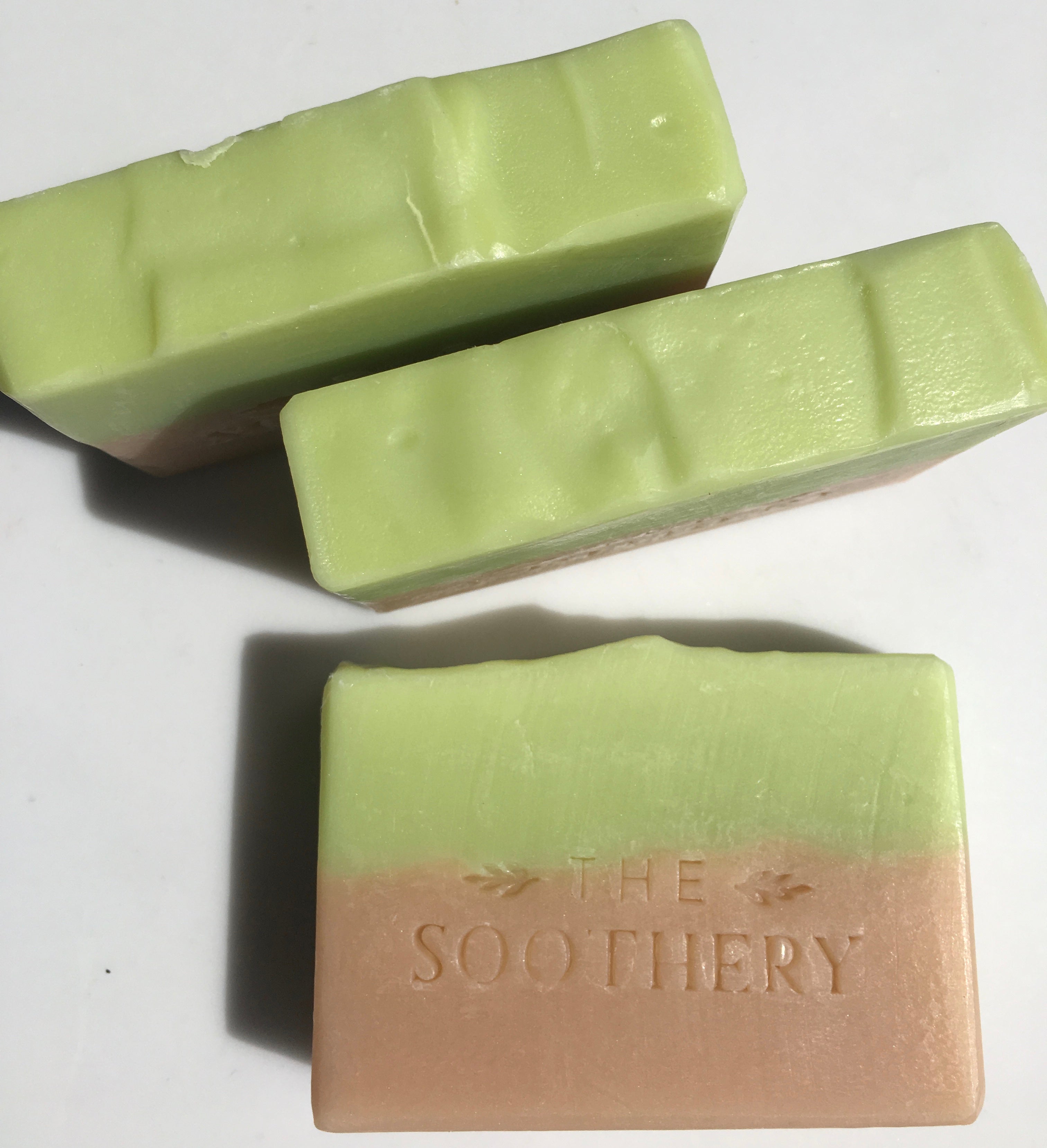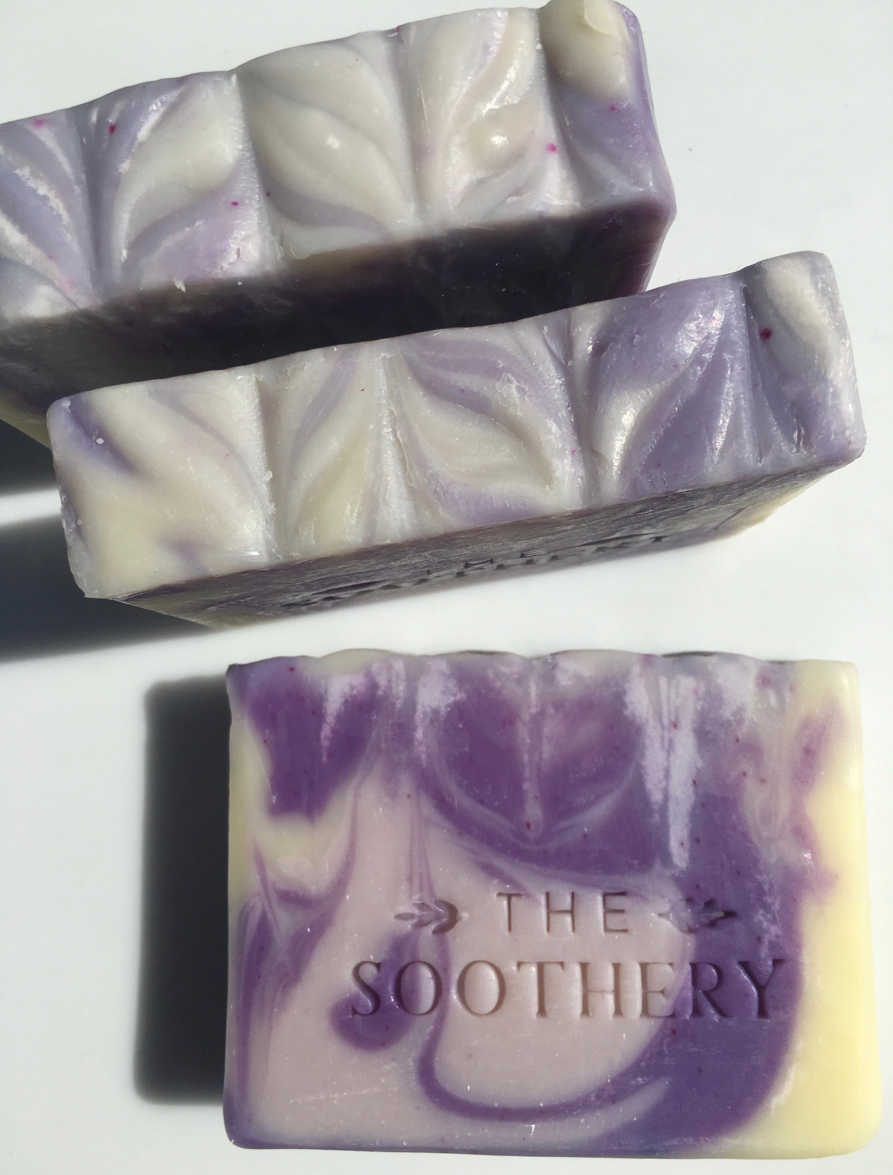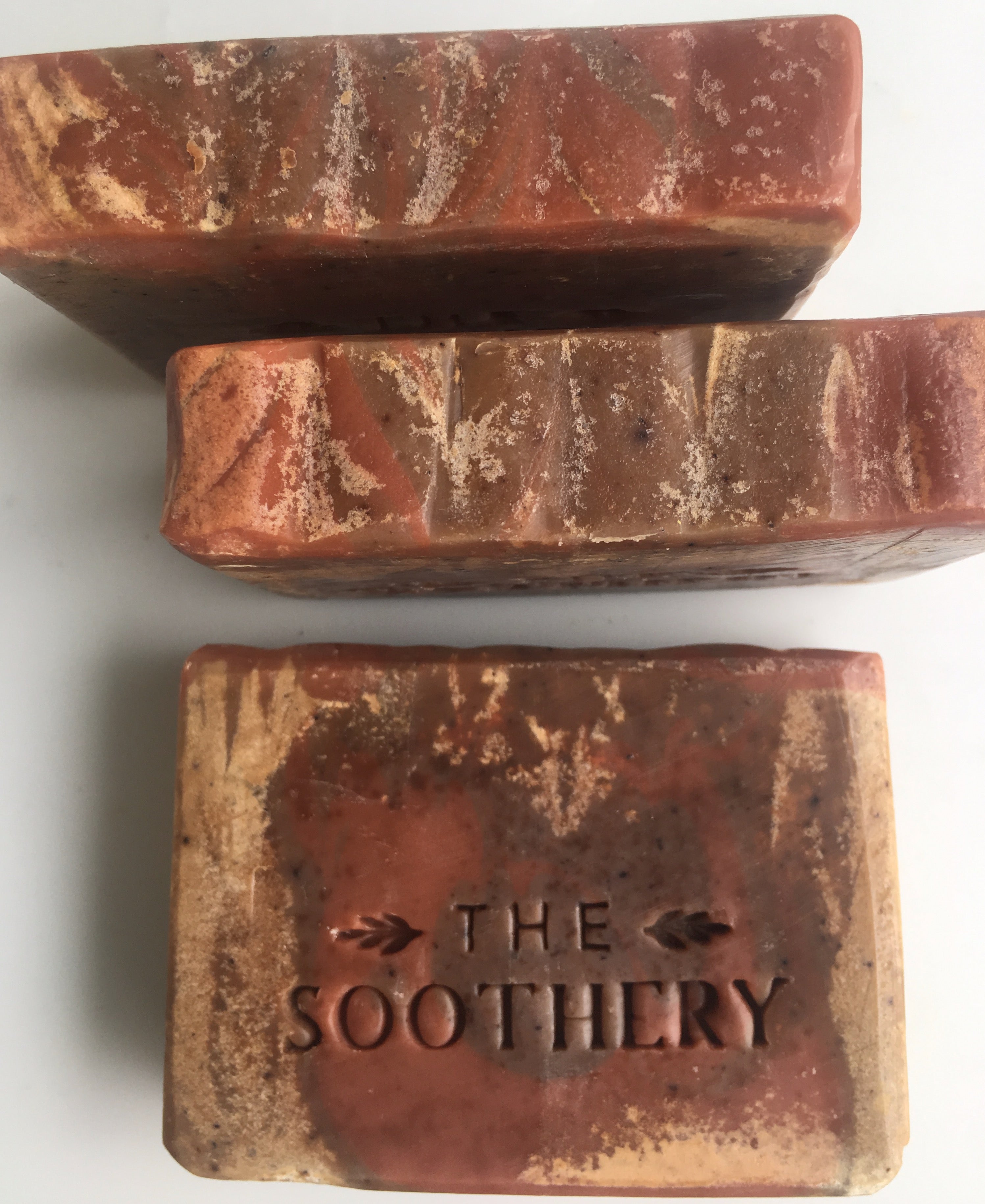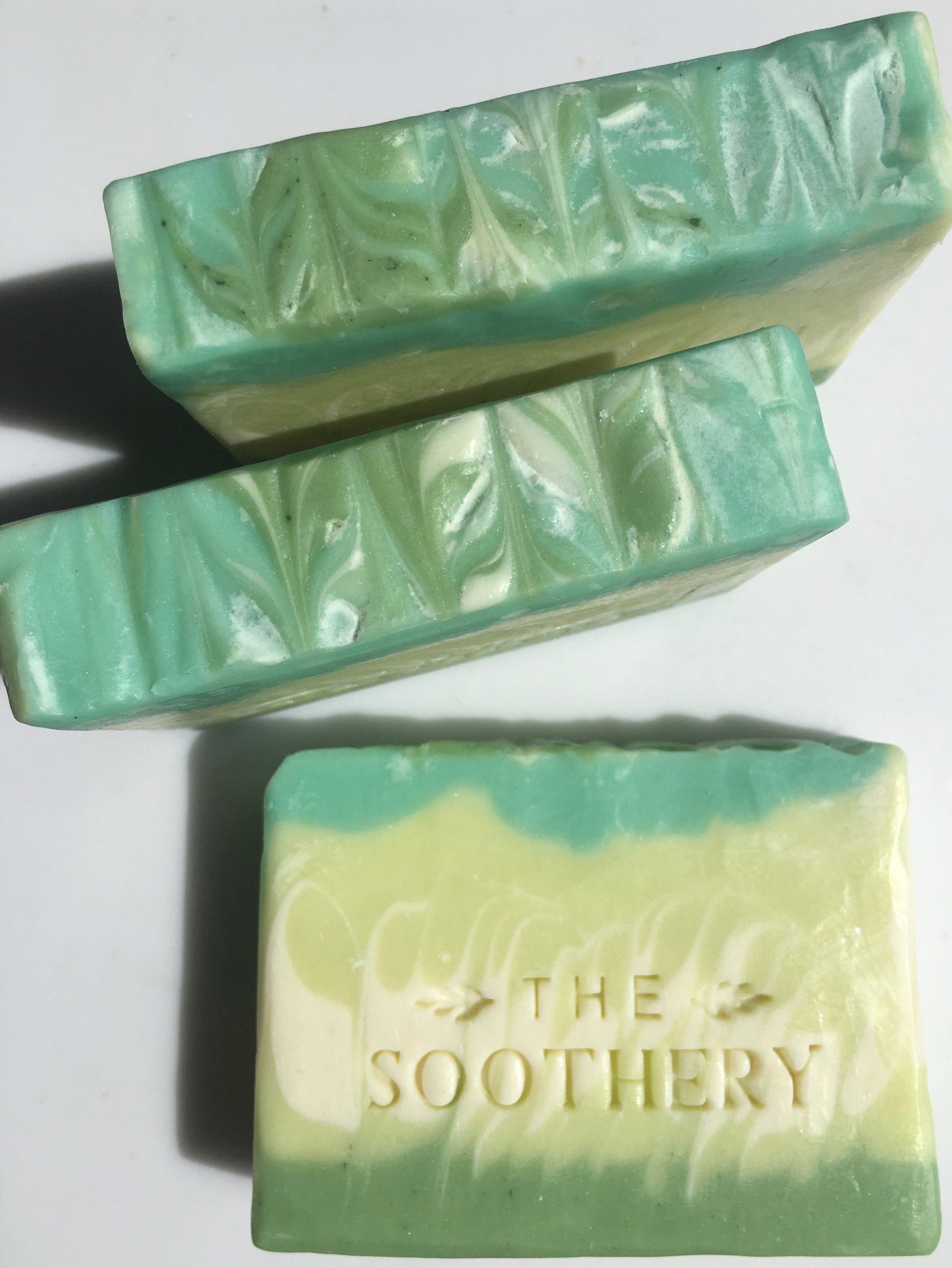 The Soothery Soaps are a handmade, small batch product and each Soap Bar has slight variations in color and design. Every Soap Bar is very high quality, long-lasting, and large: 5.3-5.5 ounces in weight and approximately 3 3/4" wide by 2 3/4" high. Soaps in the Pure Solace line are approximately 3" wide and 3 1/4" high.