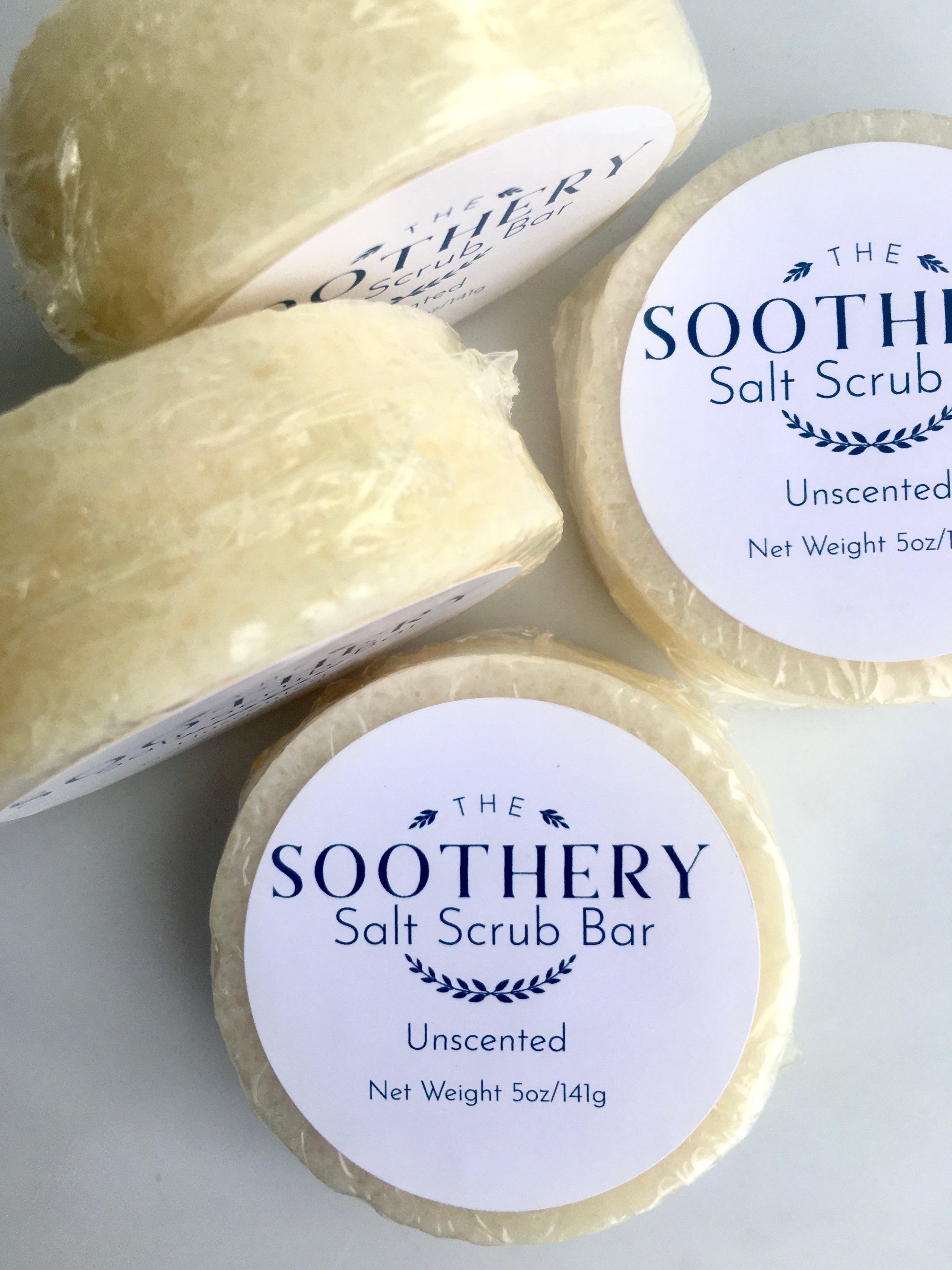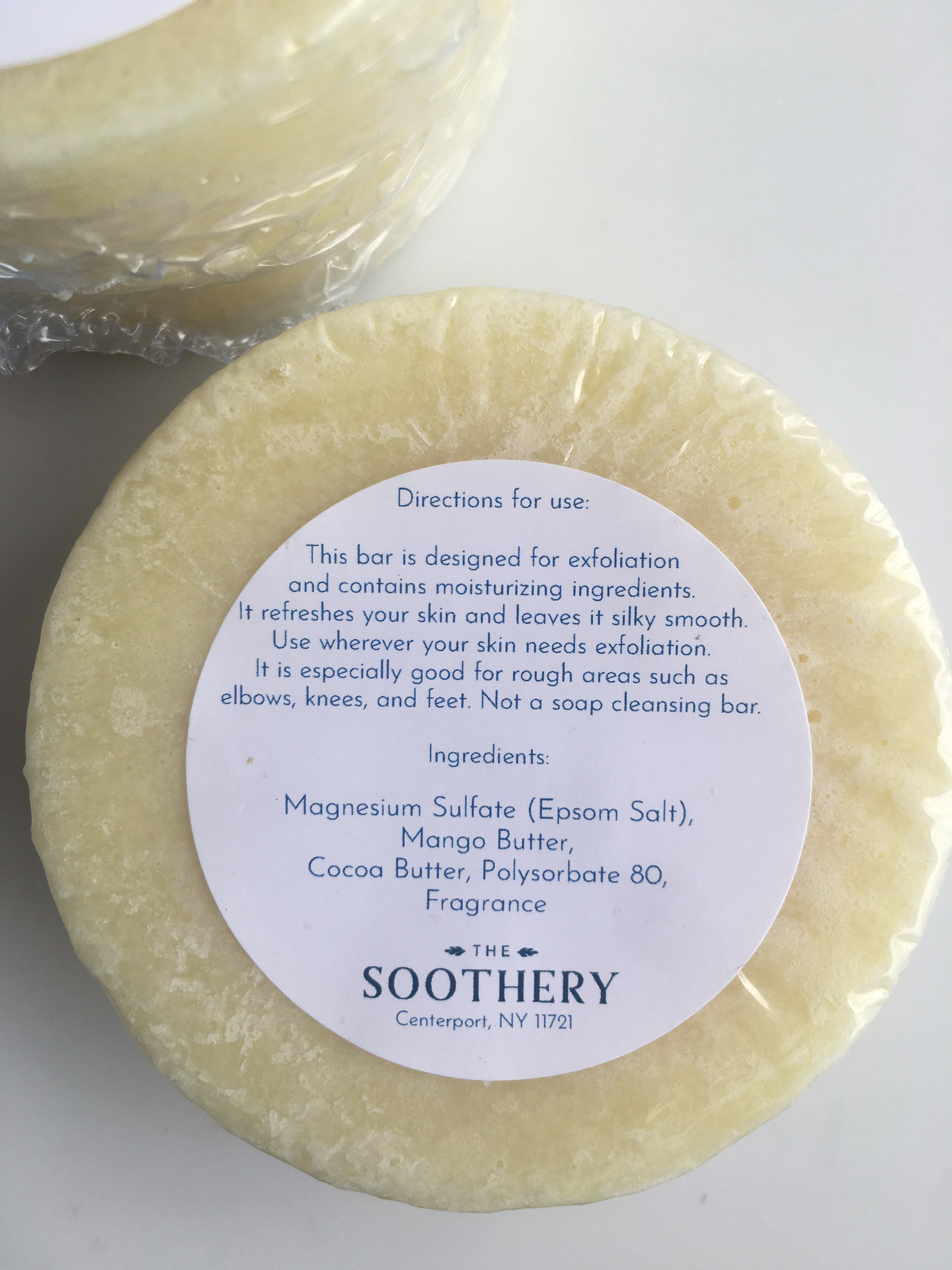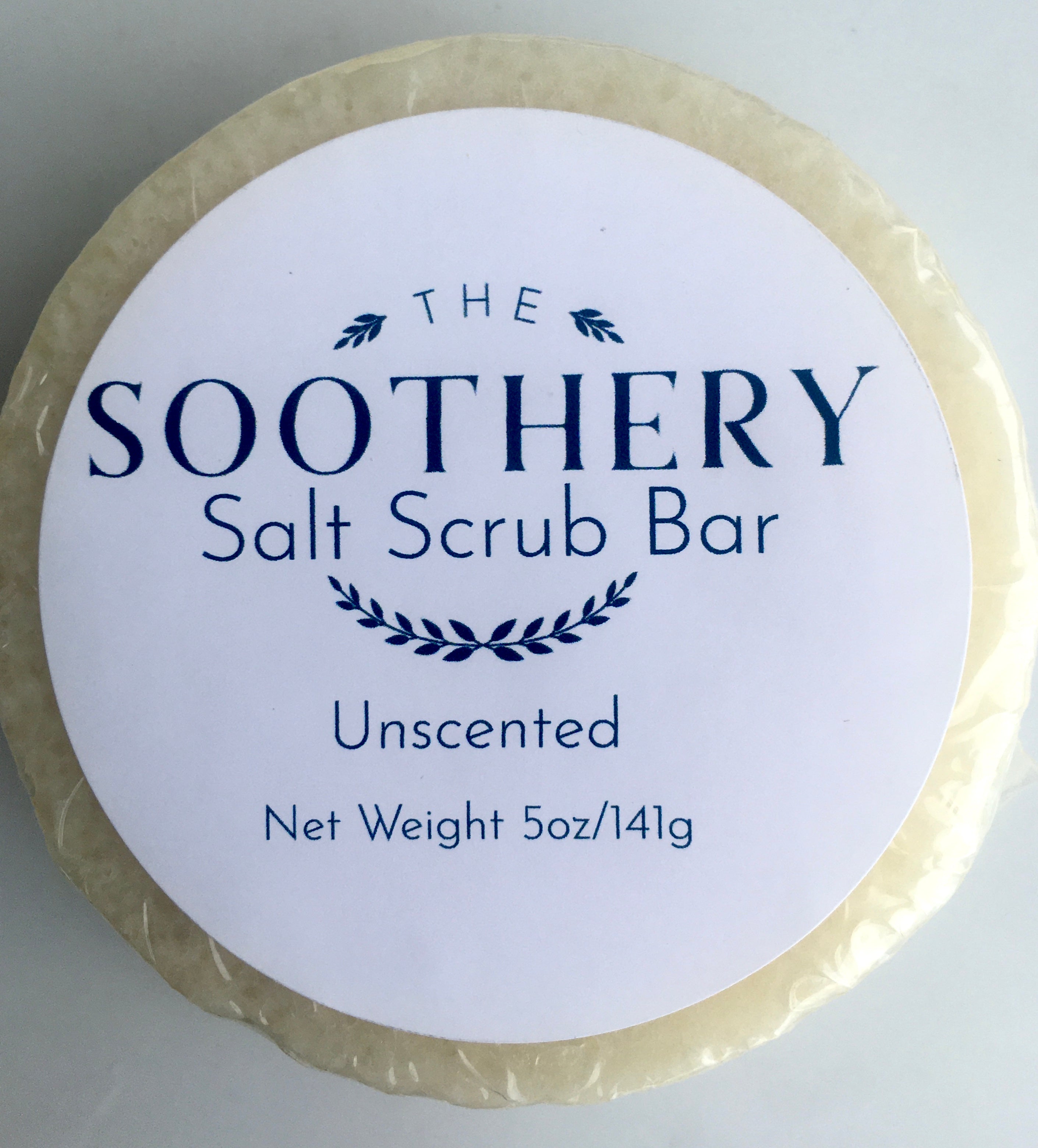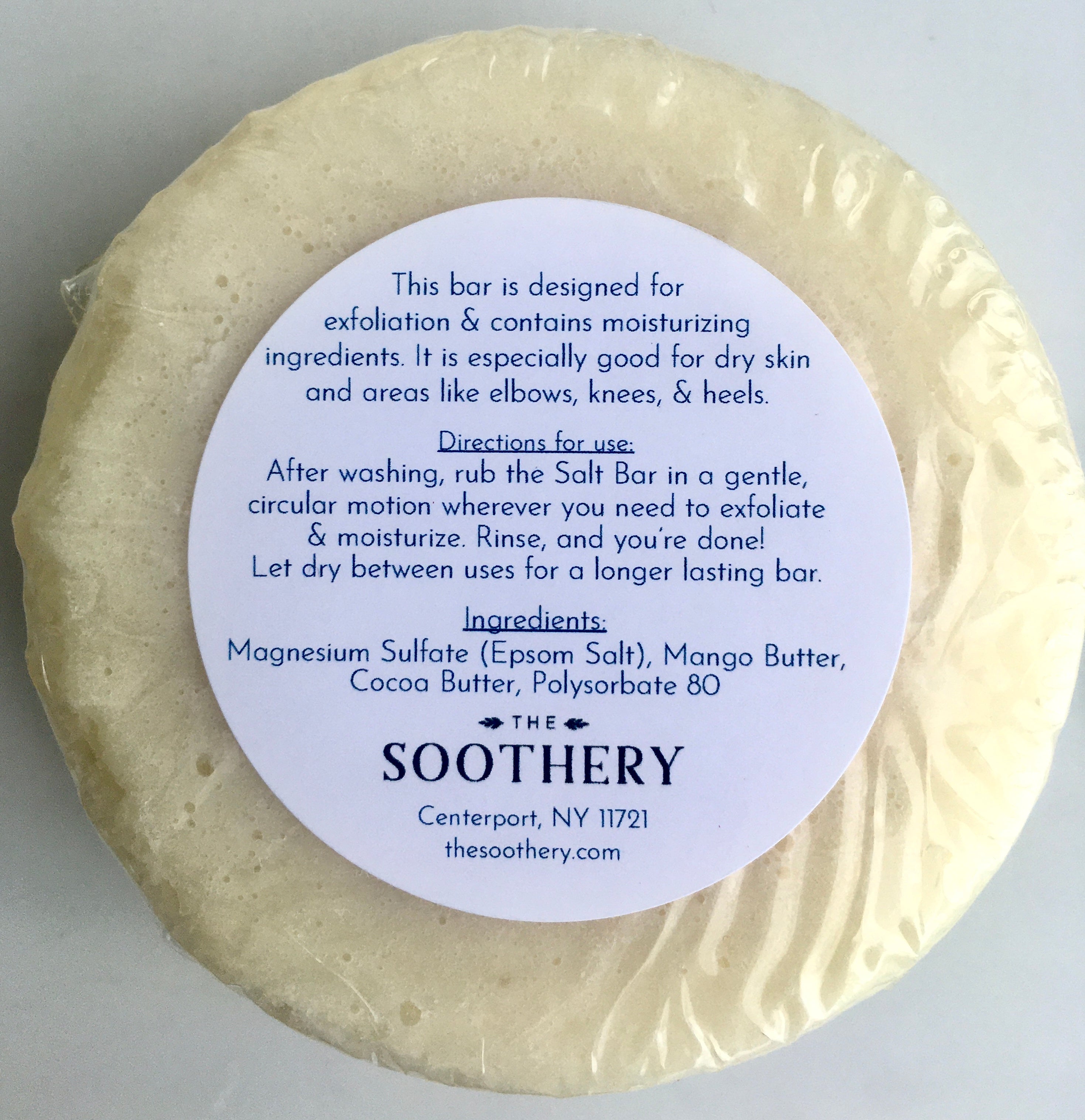 Directions for use: After you cleanse in the shower, take the Salt Scrub Bar and gently rub on your arms, legs, and/or torso in a circular motion; then rinse off. The Epsom Salts gently exfoliate while the butters and oils sink into your skin and moisturize.