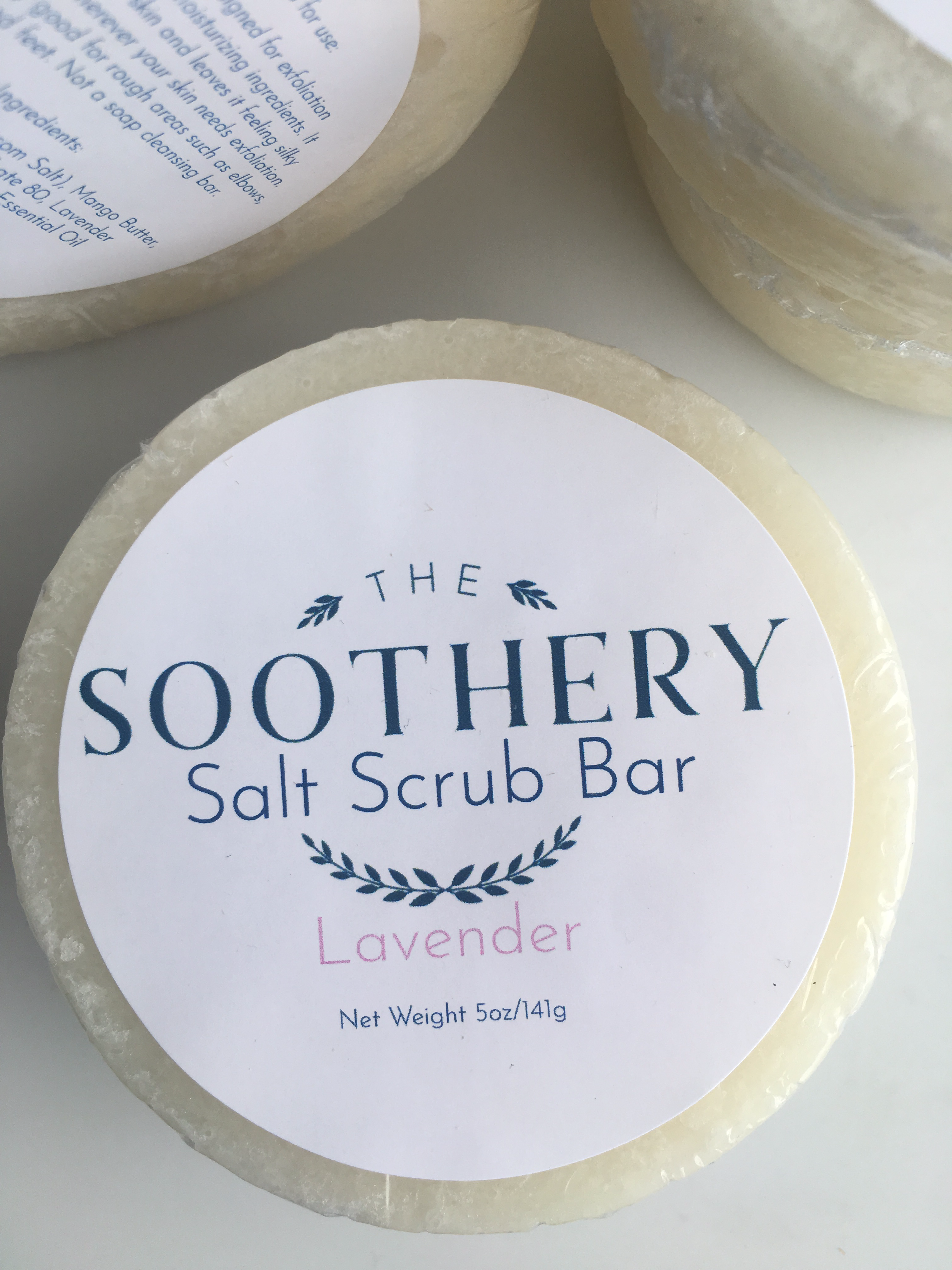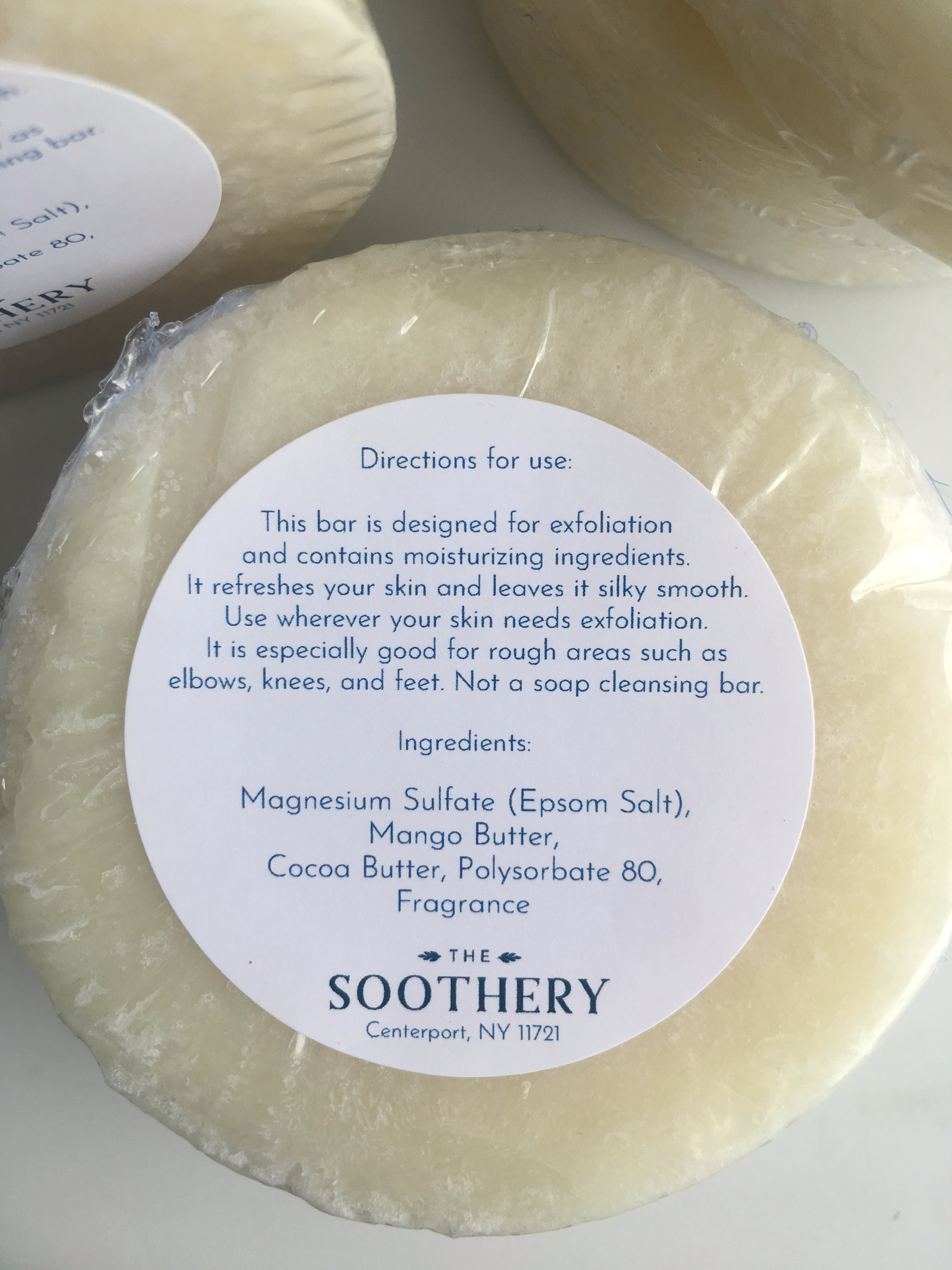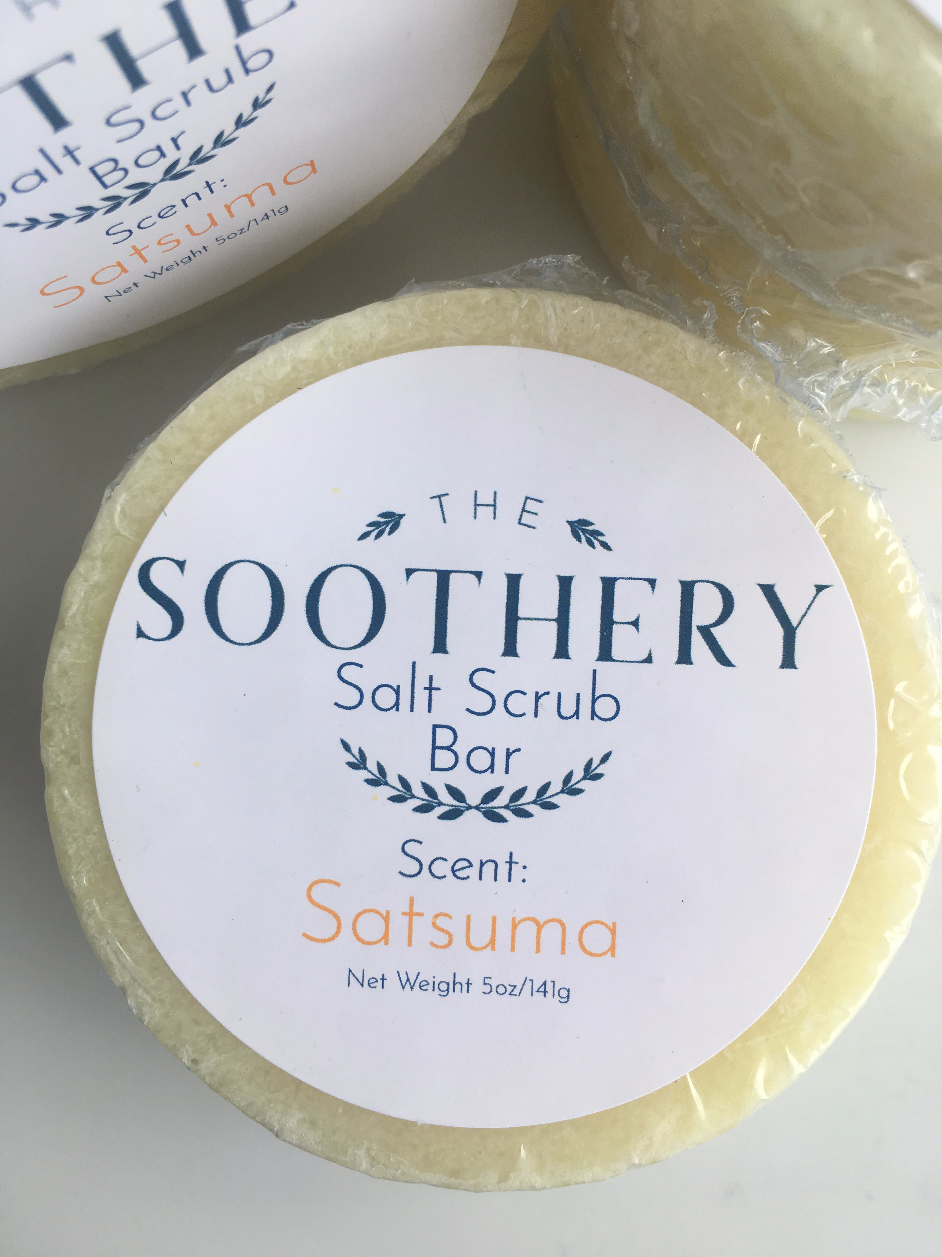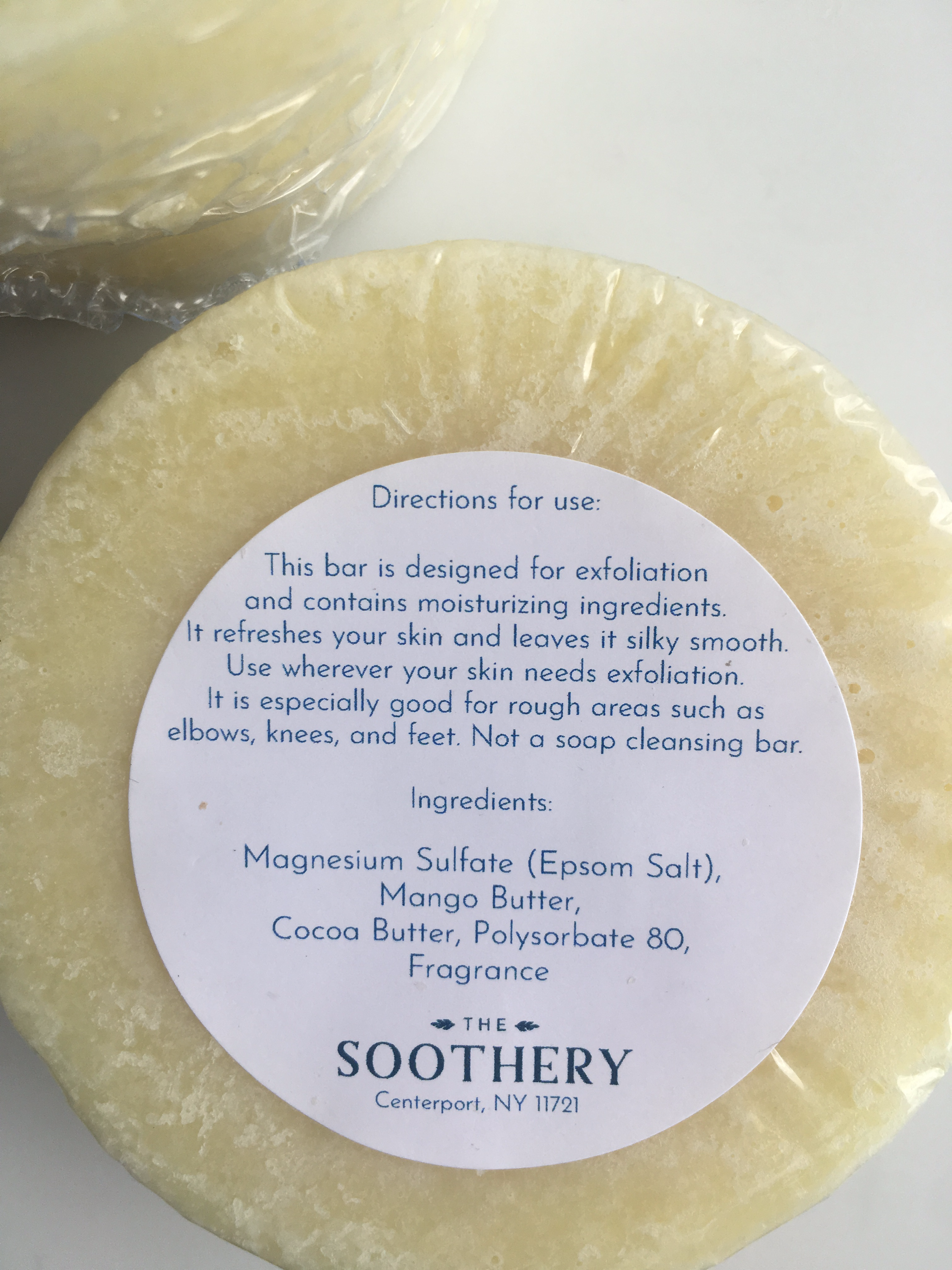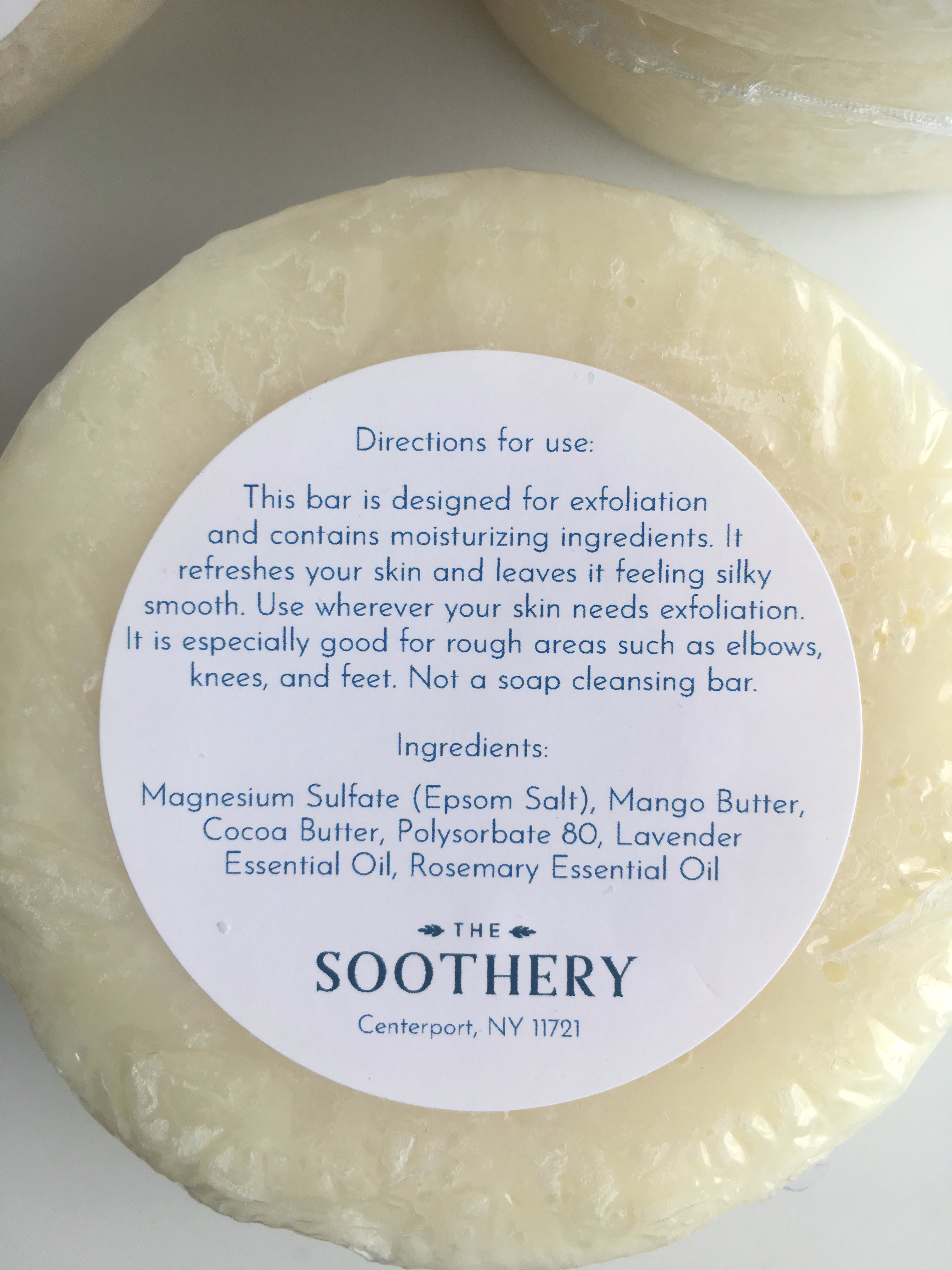 Directions for use: After you cleanse in the shower, take the Salt Scrub Bar and gently rub on your arms, legs, and/or torso in a circular motion; then rinse off. The Epsom Salts gently exfoliate while the butters and oils sink into your skin and moisturize.