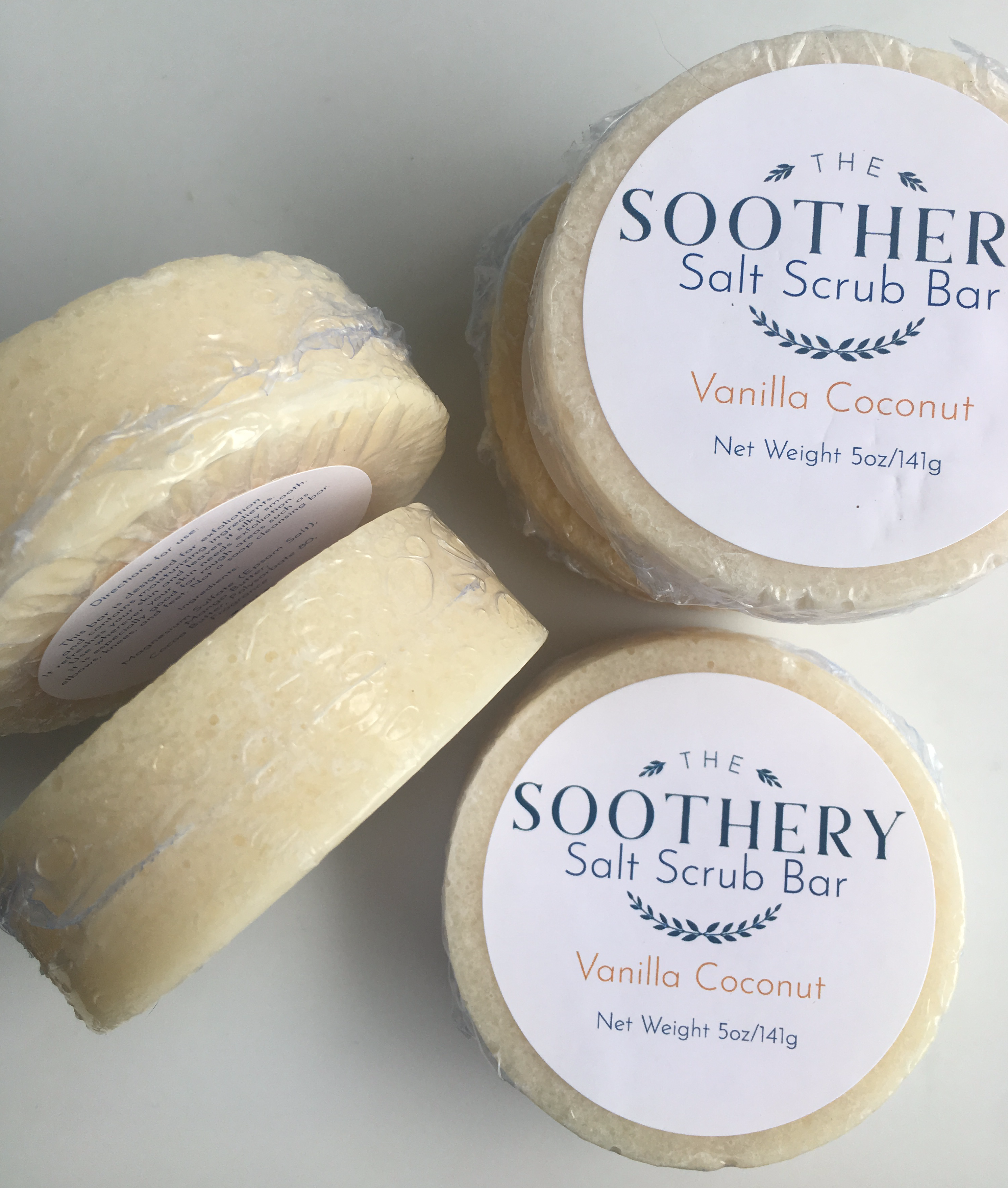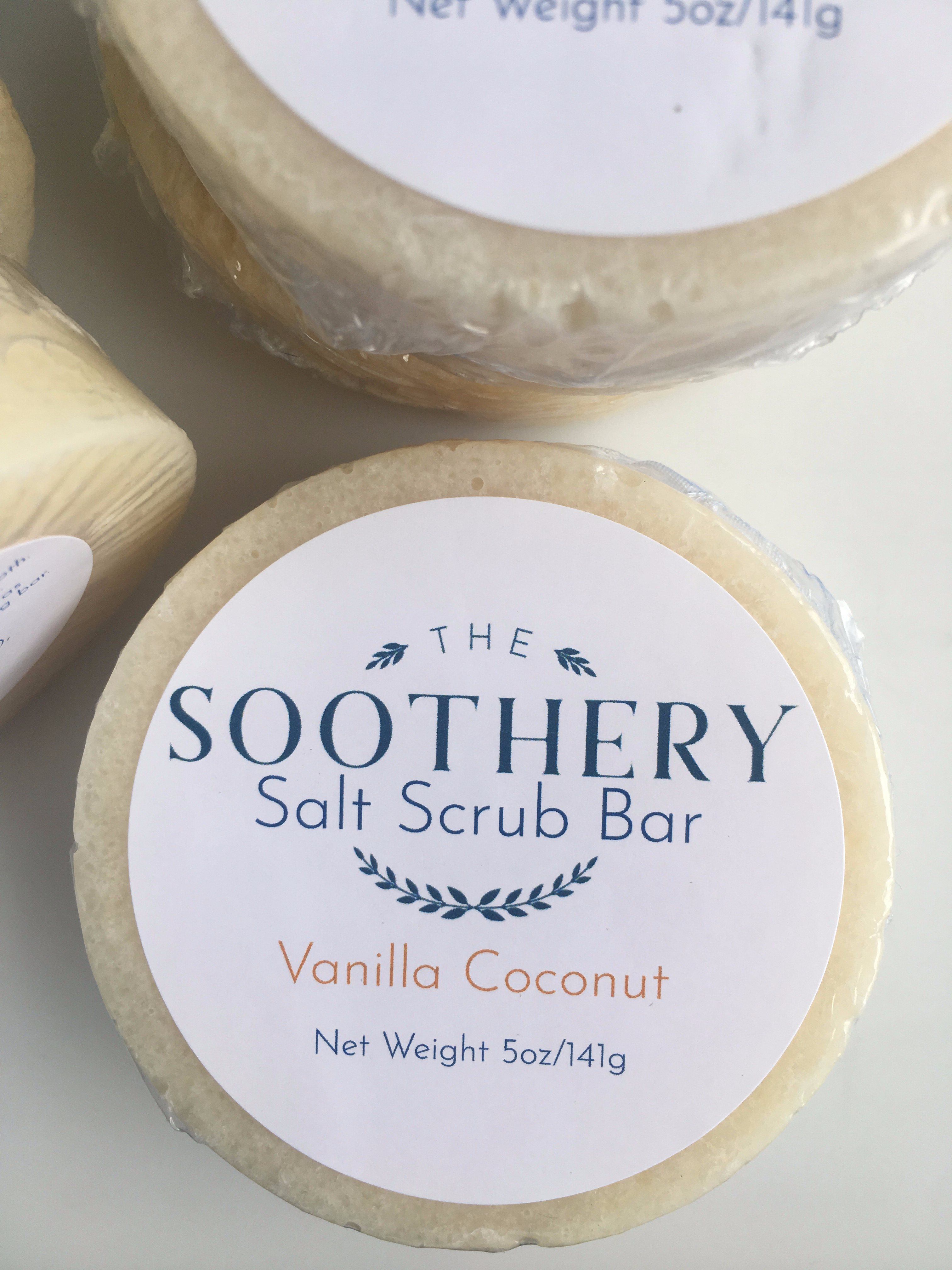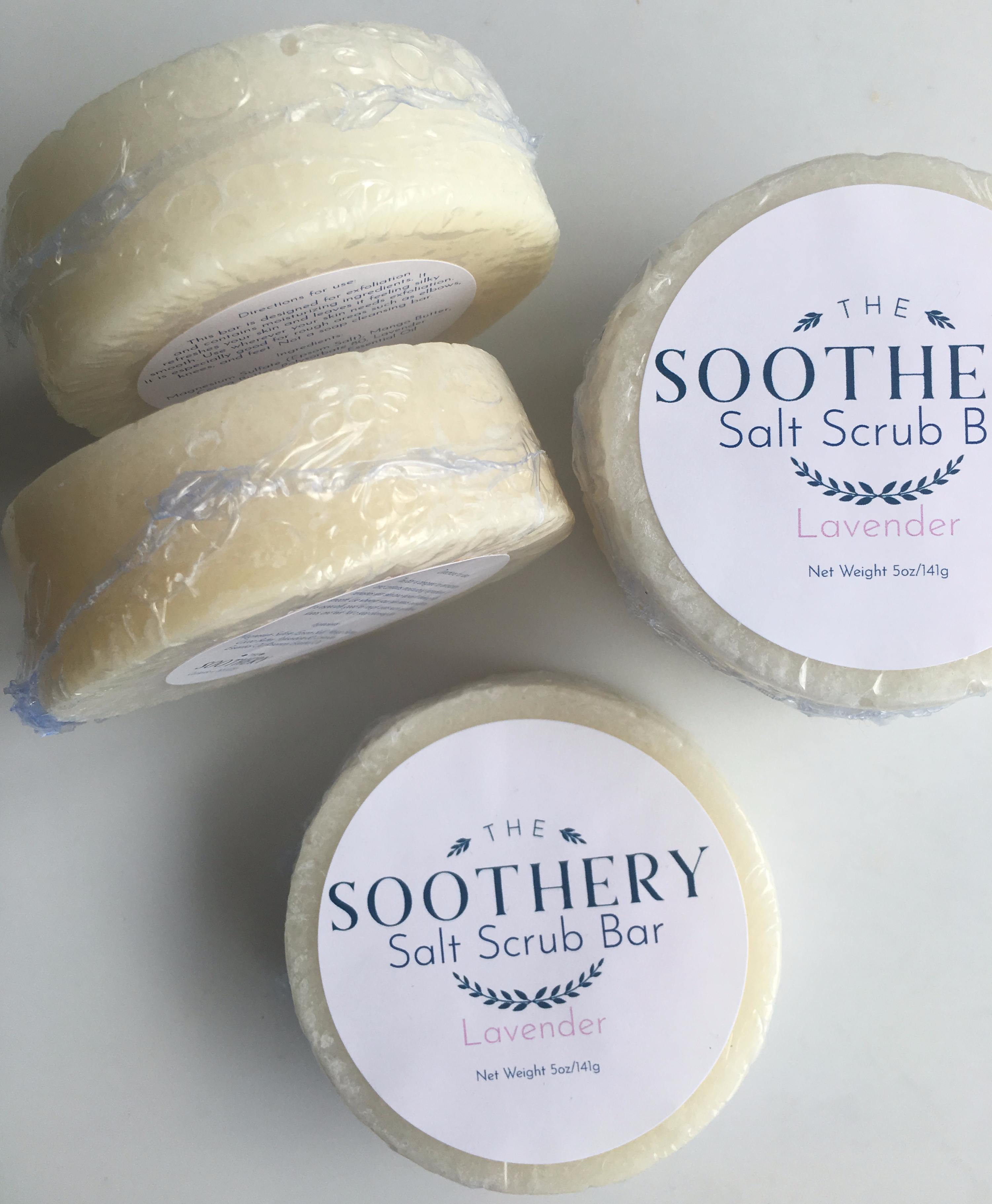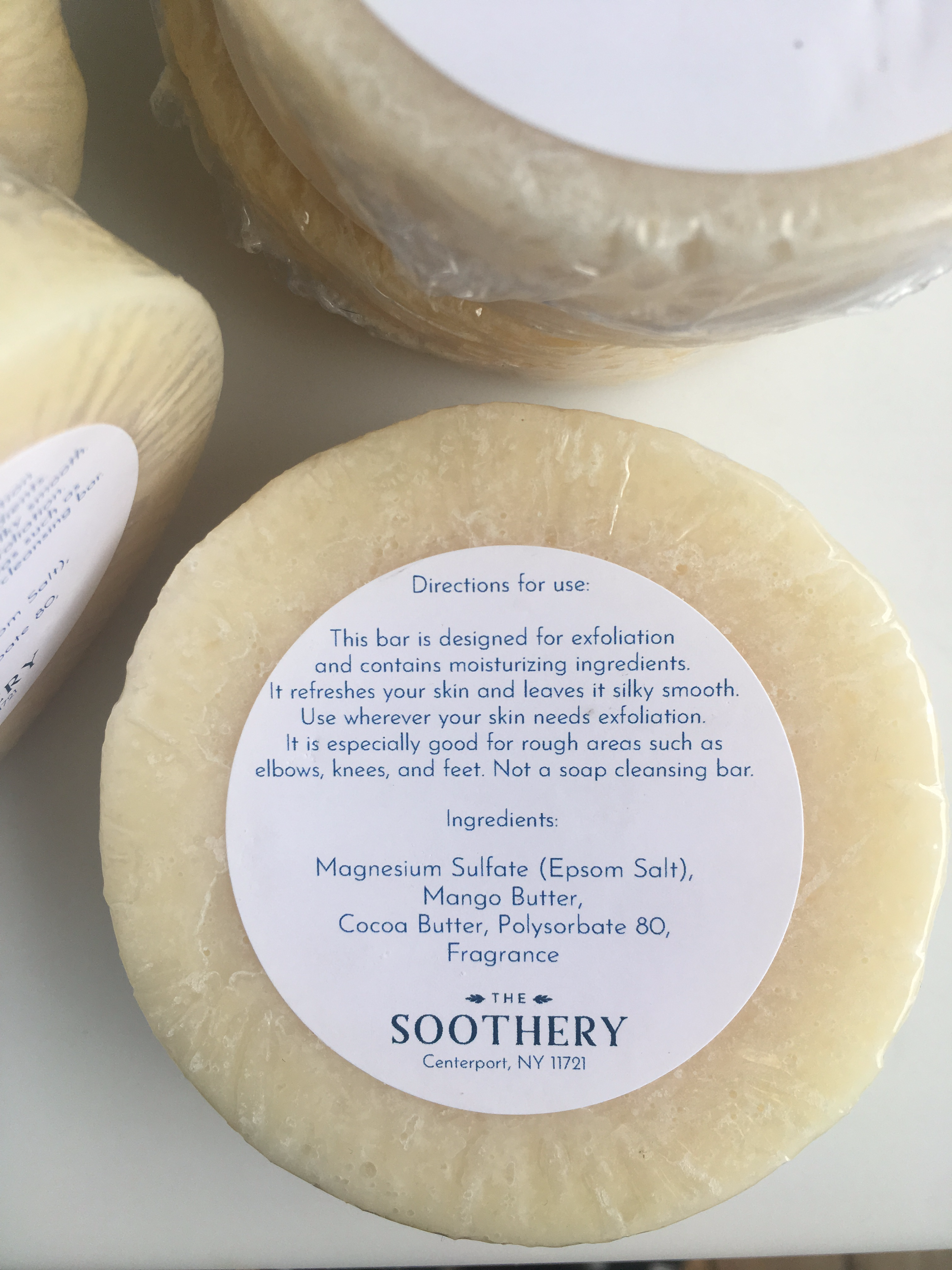 Directions for use: After you cleanse in the shower, take the Salt Scrub Bar and gently rub on your arms, legs, and/or torso in a circular motion; then rinse off. The Epsom Salts gently exfoliate while the butters and oils sink into your skin and moisturize.
