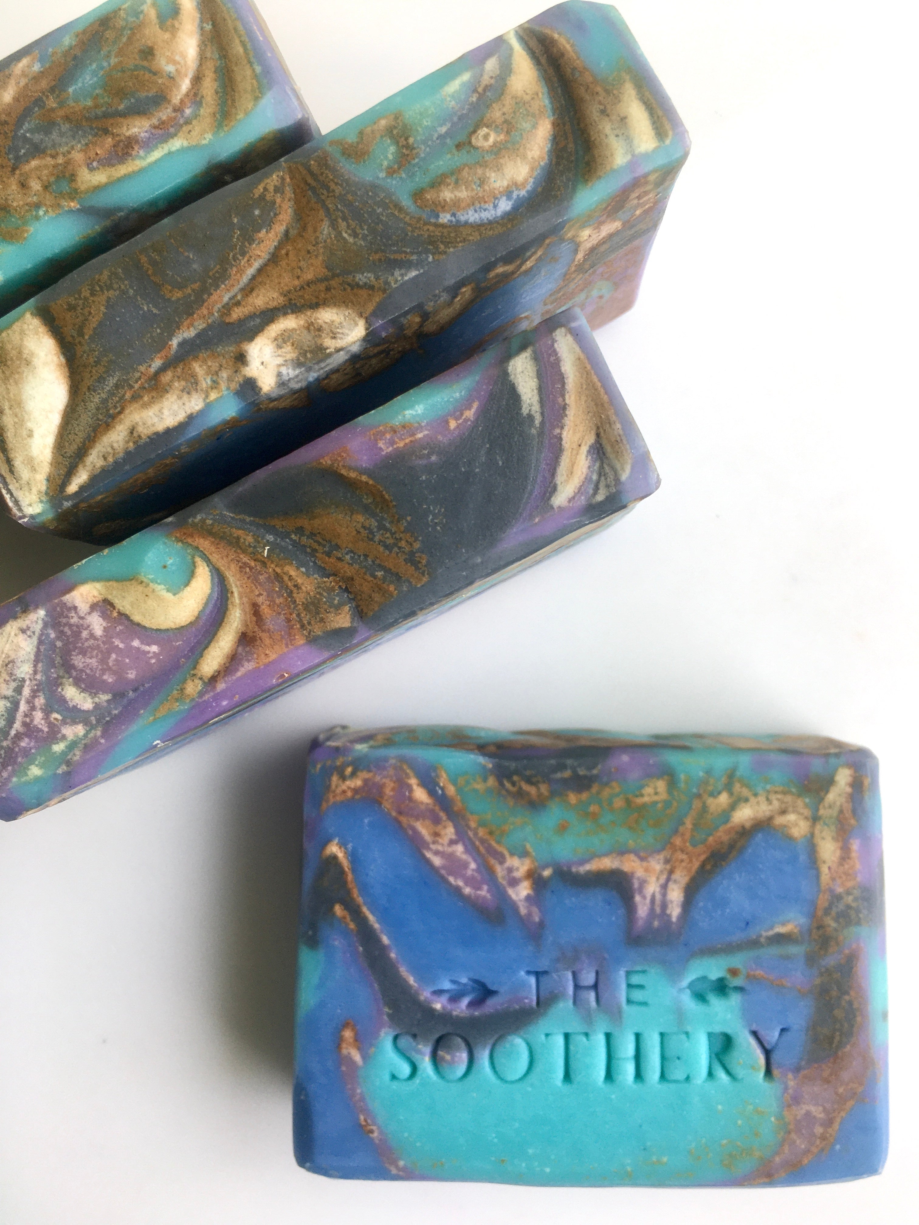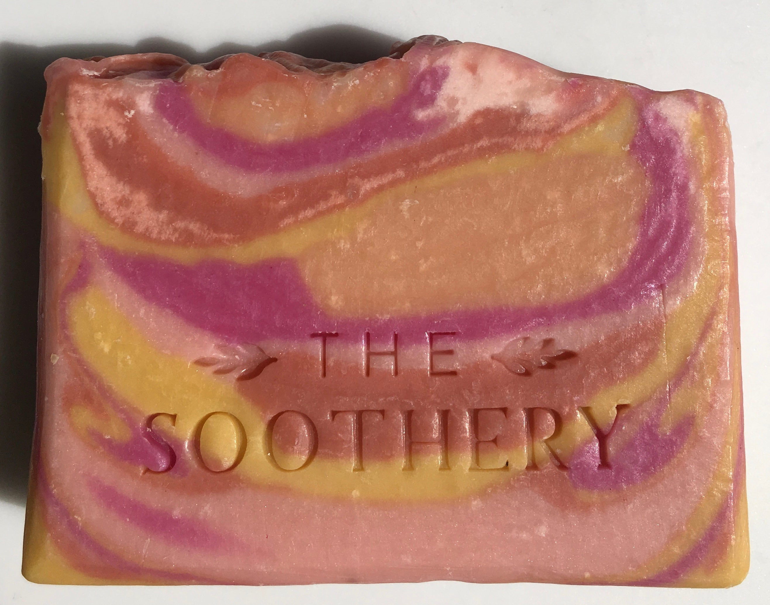 This is a handmade, small batch product and each Soap Bar has slight variations in color and design. Soap Bar is 5.3-5.5 ounces in weight and approximately 3 3/4" wide by 2 3/4" high.