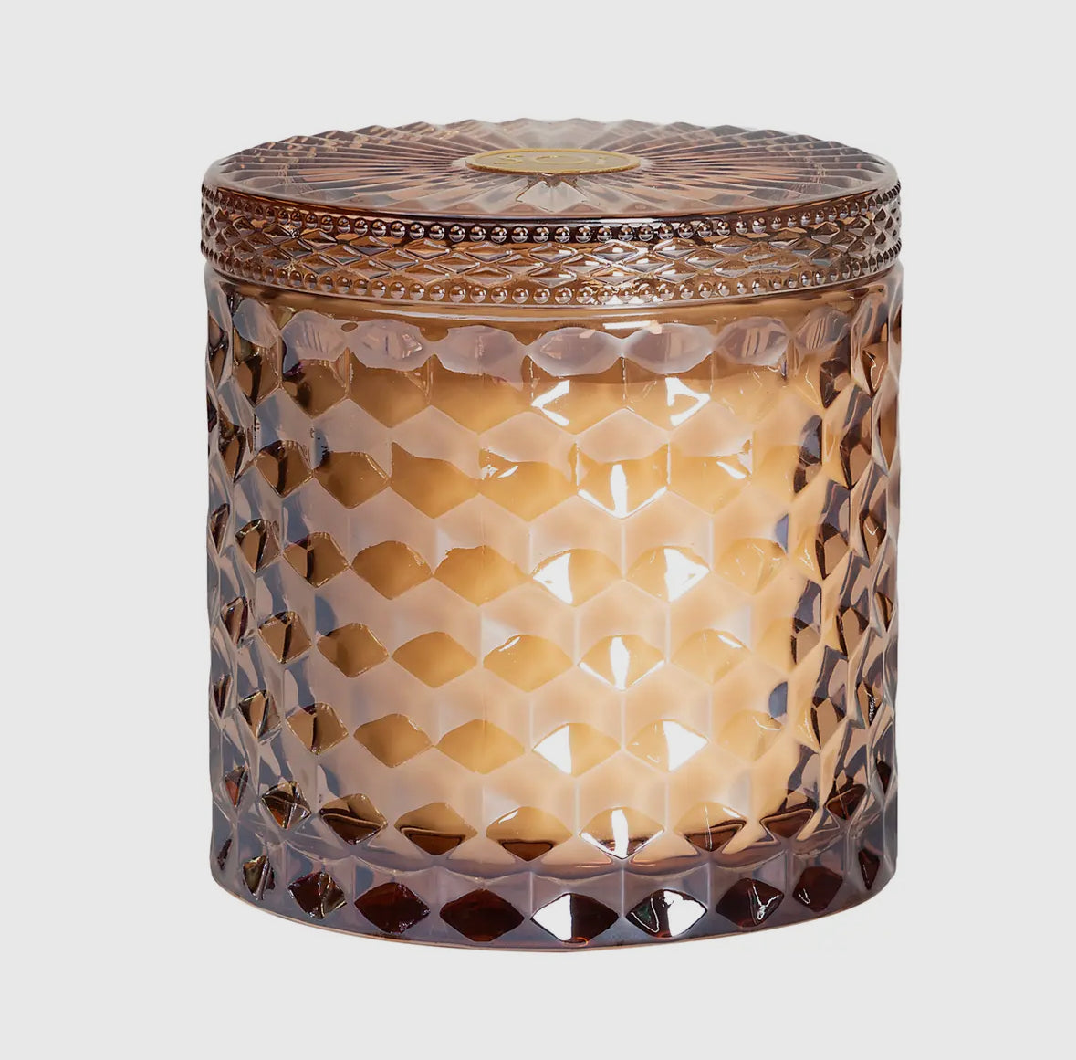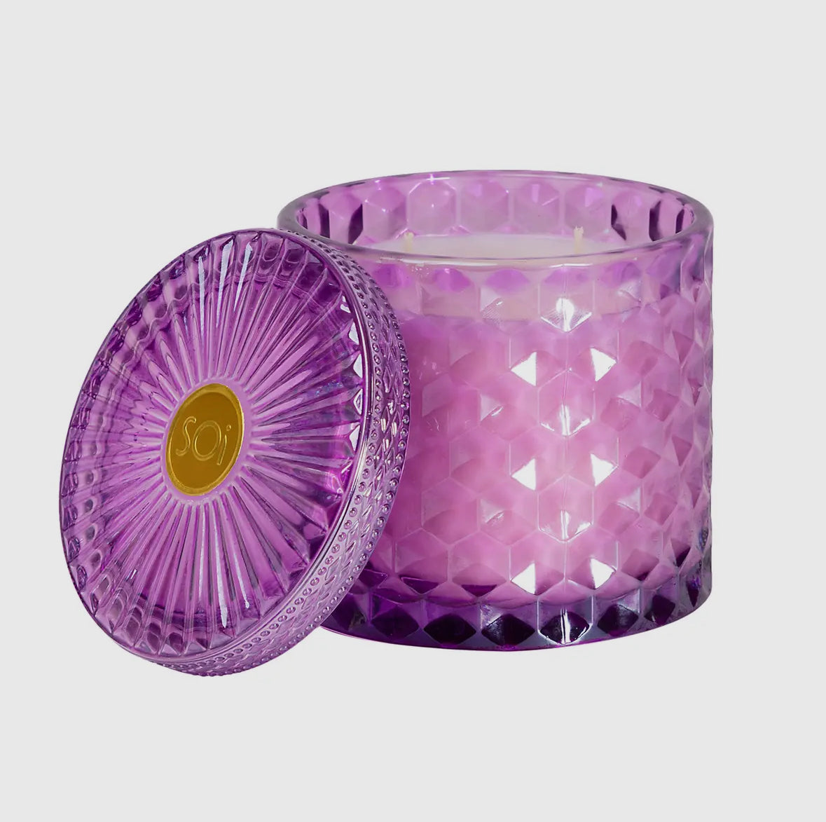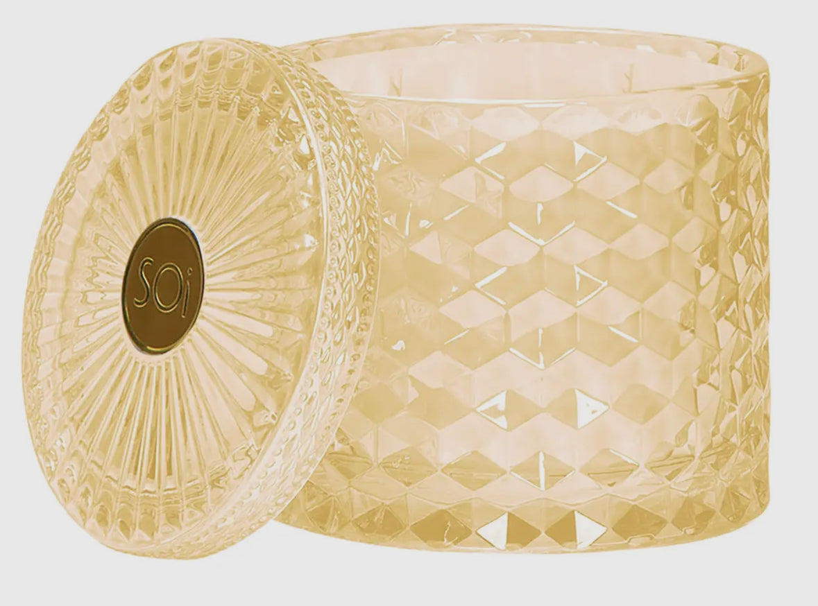 These 15oz soy-blend, cotton wicked candles come in a beautiful, shimmering, diamond-cut glass lidded jar. Poured by hand, each scent is luxurious and divine, and adds a special ambiance to any room. The jars are 4x4x4 and they have a 55 hour burn time. The beautiful glass vessel can be used as a keepsake when the candle is finished. See below for scent descriptions: